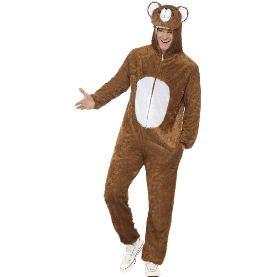 Déguisement d'animal, pour homme ou mascotte, composé d'une combinaison en peluche marron avec cagoule assortie intégrée. Cet ensemble est disponible en taille M. Il est idéal pour se transformer en gros ours tout mignon pour un carnaval ou un anniversaire.