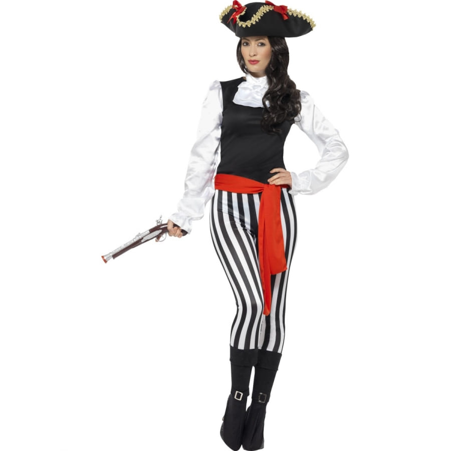 Osez défier les pirates mesdames ! Transformez-vous en un corsaire légendaire le temps d'une soirée costumée. Embarquez pour l'action et l'aventure dans ce costume pantalon rayé de corsaire pour femme. Vous porterez un superbe pantalon à rayures verticales noires et blanches, avec couvre bottes intégrés. Vous disposerez aussi d'un petit haut noir et blanc, ainsi que d'une collerette blanche. L'ensemble sera en parfaite harmonie grâce à la ceinture rouge à attacher tout simplement autour de la taille. Vous aurez également l'occasion de vous fournir en accessoires sur notre site. Comme sur la photo, optez pour un chapeau de corsaire et pour une épée ou un revolver. Bienvenue dans l'univers impitoyable des grands corsaires !