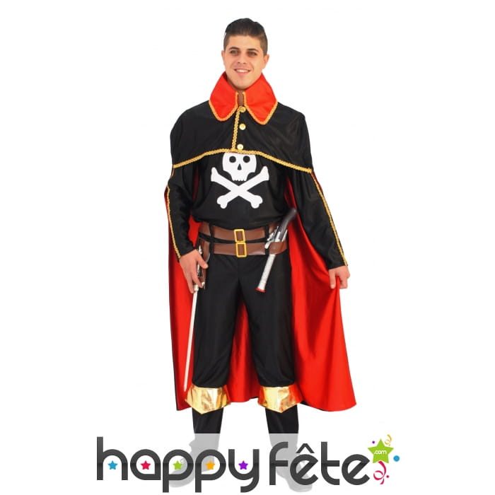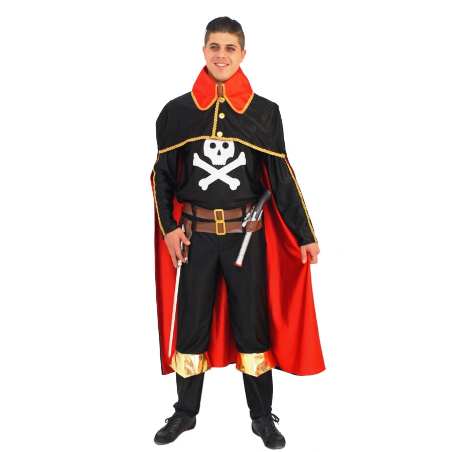 La vocation de sauver notre planète des évasions extra-terrestres n'est pas donnée à tout le monde. Mais avec ce déguisement du pirate de l'espace Albator, vous pourriez, sans nul doute, commencer à vous préparer à cette noble tâche. Cette tenue est formée d'une combinaison noire avec un grand col rouge à ornements dorés, décorée de l'incontournable tête de mort du pirate au milieu et avec des bottes à parures dorées préalablement attachées à la combinaison, d'une double ceinture marron pour mettre les armes indispensables à un pirate de l'espace, et d'une grande cape rouge. Vous mettrez tout ceci avec des chaussures noires pour que l'illusion des bottes noires soient réussies. Idéal pour Halloween ou les soirées science-fiction, les tailles proposées sont: 50-52/54-56/58-60.