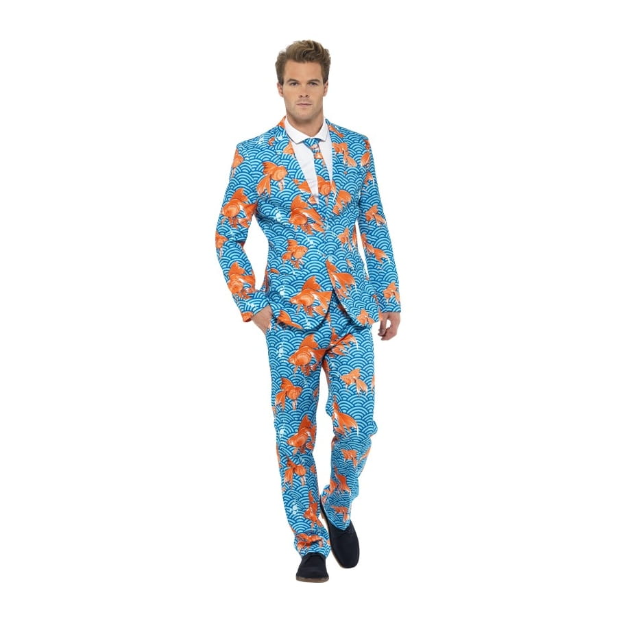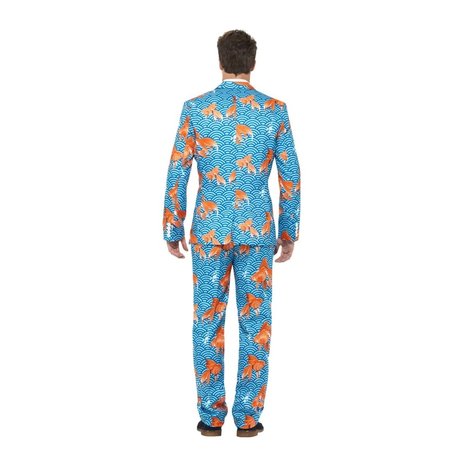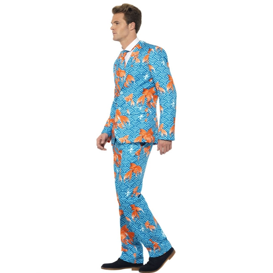 L'univers des fonds des mers vous fascine (ou du fond de l’aquarium)? Voici une tenue qui vous fera sentir comme un poisson dans l'eau. Ceci est un costume poisson rouge 3 pièces pour homme. L’ensemble est de couleur bleue imprimé de partout. Vous pourrez mettre une chemise blanche pour assortir l'ensemble. Très original, vous pouvez le porter lors d'une fête sur le thème du monde marin... et si l'occasion ne se présente pas, la fête, ce pourrait être vous, Messieurs, qui allez l'organiser! Ce costume est disponible en tailles M (correspondant à poitrine de 96 - 101 cm, et entrejambe 83,8 cm), L (correspondant à poitrine de 106 - 110 cm, et entrejambe 83,8 cm), et XL (correspondant à poitrine de 116 - 121 cm). Il est conseillé de le nettoyer à sec uniquement.