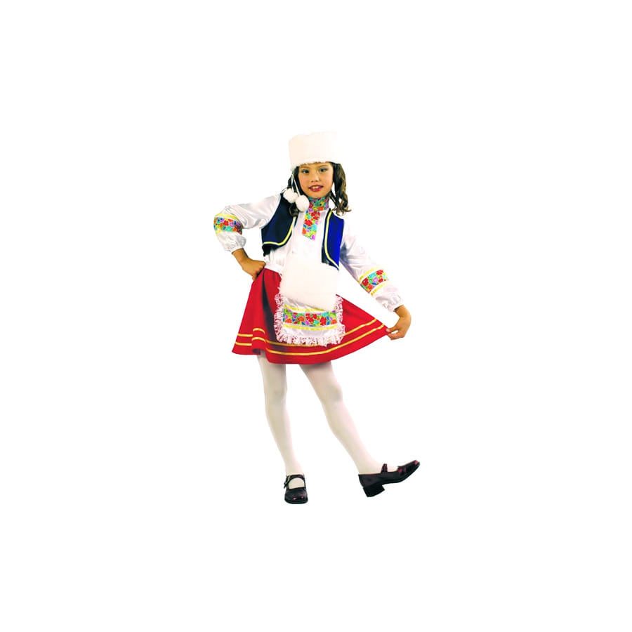 Ce déguisement complet de poupée russe transformera votre princesse en véritable poupée. Elle sera complètement changée et tous les regards se poseront sur elle. Elle pourra le porter durant une fête déguisée ou même le carnaval. Le déguisement est composé d'une coiffe blanche avec deux pompons, d'un gilet bleu avec bordures jaunes, d'une chemise blanche avec des bandes multicolores dessus, d'une jupe rouge avec bordure jaune, d'un tablier blanc et de manchons. Elle sera la plus admirée de la fete.