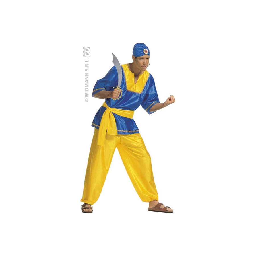 Costume de prince des voleurs pour homme composé d'une tunique jaune et bleue, d'un pantalon jaune et d'un turban bleu. Cet ensemble conviendra parfaitement à une soirée 1001 nuits.