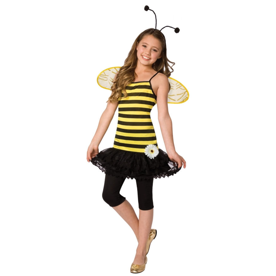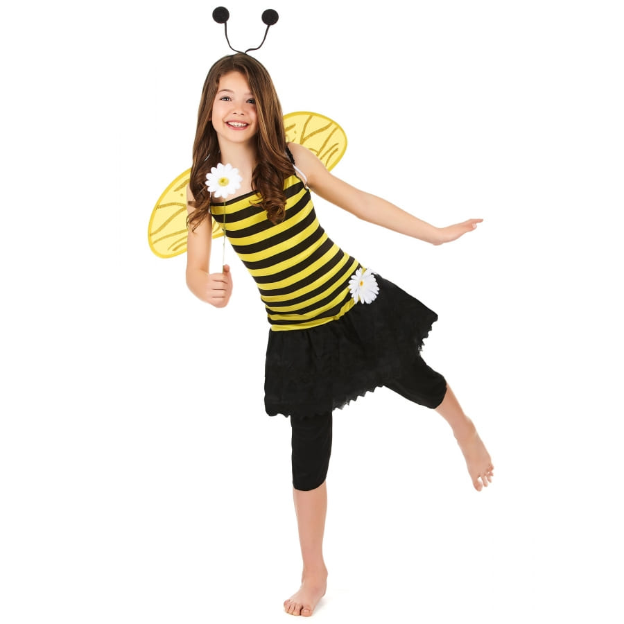 Elle butine sur les fleurs puis s'envole toute joyeuse pour retourner dans sa ruche ! Entrer dans la peau d'une abeille ne sera qu'une affaire de déguisement. Votre petite fille va rayonner dans ce costume rayé jaune et noir de petite abeille. Elle sera revêtue d'une robe à rayures noires et jaunes, sans manches, avec voile en tulle et petite fleur de marguerite à la taille. En dessous de la robe, elle portera un pantacourt noir, élastique au niveau de la taille. L'ensemble robe-pantacourt lui donnera une allure de danseuse. Disposez également d'une paire d'ailes jaunes pour bien équiper la petite abeille. Quant à la coiffure, elle sera accessoirisée par un serre-tête noir, surmonté par deux petites antennes.