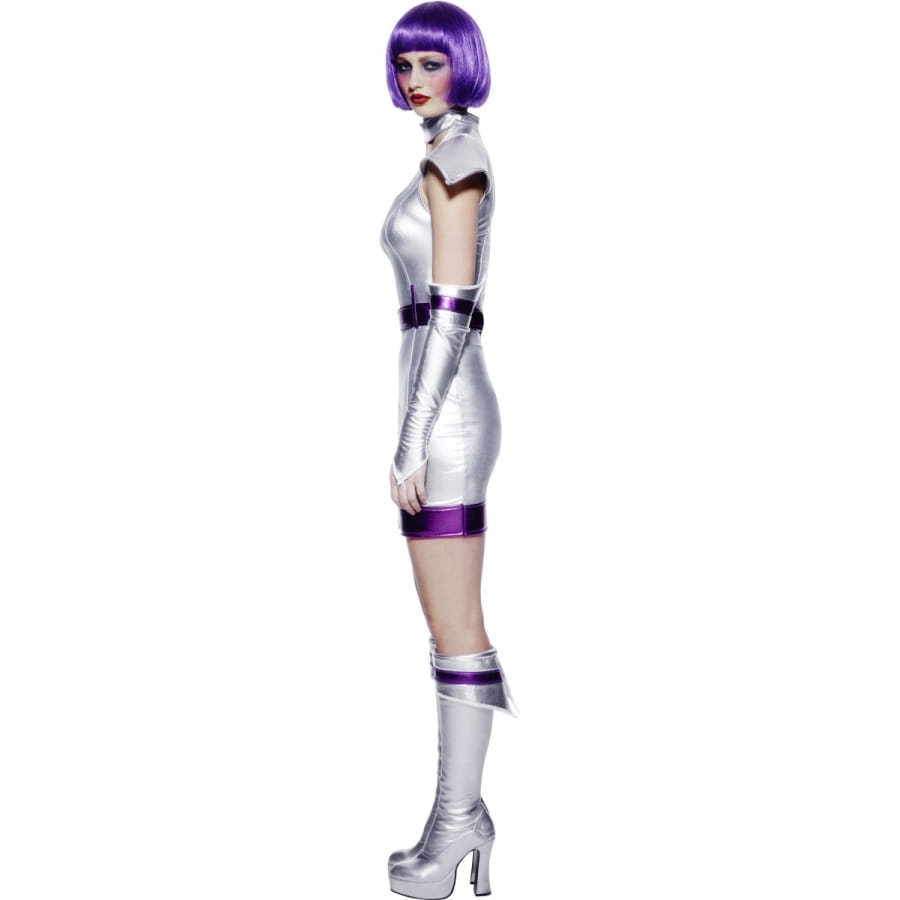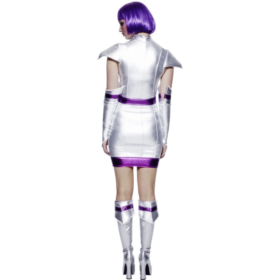 Vous pourrez sans problème vous rendre à une fête intergalactique avec cette robe très courte de couleur argentée avec bordure pourpre, la ceinture et une paire de gants et de surbottes. Cet ensemble est disponible en taille M, S ou L. C'est le déguisement parfait pour devenir une vraie reine de l'espace.