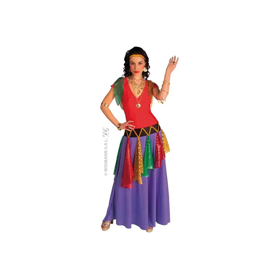 Vous irez danser auprès d'un feu de camp? Laissez-vous tenter par cette robe en toile stretch, la ceinture et le serre-tête. Cet ensemble multicolore est parfait pour se déguiser en reine des Gitans ou en danseuse bohémienne pour un carnaval.