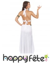 Incarnez une reine grecque avec ce somptueux déguisement que nous vous proposons ici. Il est dédié à la gente féminine de tailles : L/ M/ S. L'ensemble est composé d'une longue robe drapée blanche, ornée de rubans dorés et d'un bracelet assorti. La robe est sans manches, décolletée, et dévoile légèrement les hanches pour donner une allure plus sexy. Et ce ne sont pas seulement vos hanches qui seront dévoilées, mais aussi votre charme et toute votre beauté, aussi bien à l'intérieur qu'à l'extérieur. Il ne vous reste plus qu'à vous parer de vos plus beaux bijoux pour aller à une soirée de thème historique ou antique. Amusez-vous bien votre majesté !