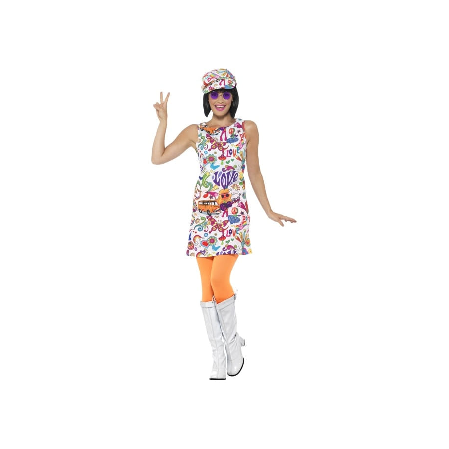 La vie en couleurs, la bonne humeur, que de belles choses à intégrer dans un déguisement ! Vous allez illuminer les coeurs dans ce costume robe blanche motifs sixties sans manches. Reprenez le style vestimentaire hippie à l'occasion d'un événement spécial, vous ne le regretterez pas. Ce déguisement est composé d'une petite robe sans manches. La robe est blanche et ornée de motifs sixties multicolores. Et ce n'est pas tout ! Elle est complétée par une jolie casquette de couleur assortie. Pour faire renaître pleinement le look des années 50-60, n'hésitez pas à rajouter quelques détails : bijoux, lunettes, paire de collants de couleur vive, paire de bottes, etc. Vous serez le rayon de soleil qui réchauffera l'ambiance !