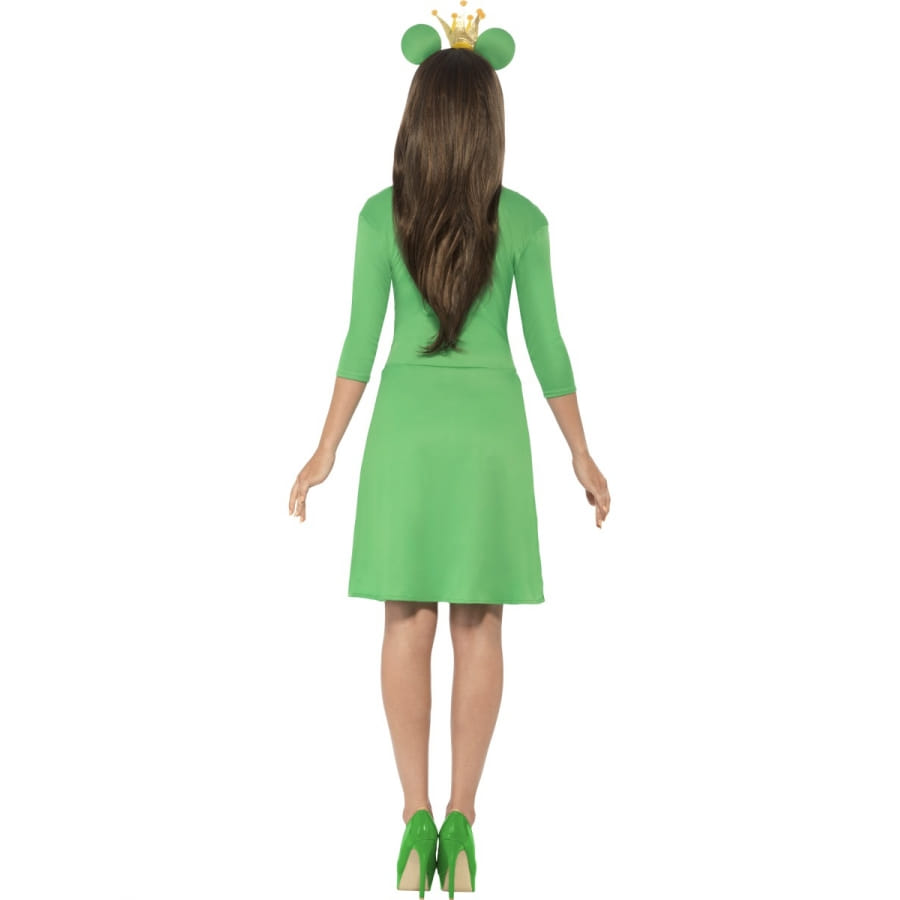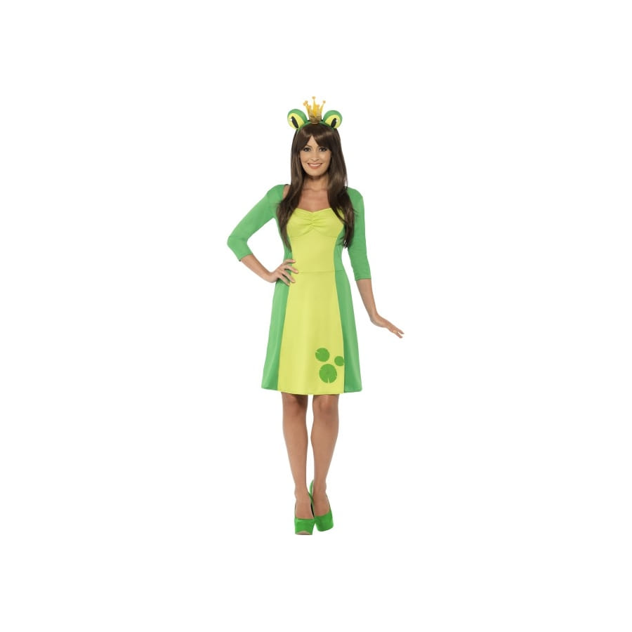 Qui vous a dit que les grenouilles se transformaient uniquement en prince charmant? C'est erroné, il y a des princesses qui étaient également des grenouilles avant, comme ce déguisement l'indique : un costume robe de princesse grenouille. Ce très joli costume comprend une magnifique robe de couleur verte en deux nuances, plus claire pour le milieu de la robe et foncée sur les côtés et les manches qui sont en 3/4. La longueur vous arrivera juste au-dessus du genou et elle est proposée en tailles L, M, S et XS. Vous aurez également un serre-tête de couleur verte, au-dessus duquel trônent les gros yeux de la grenouille et une petite couronne dorée.