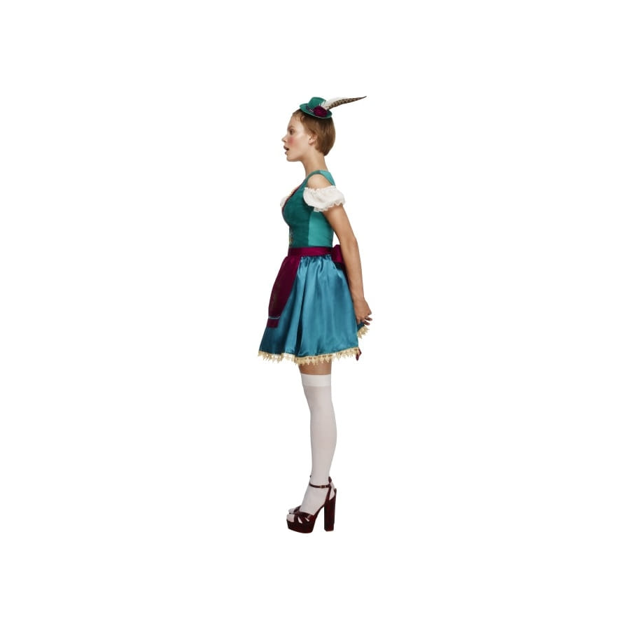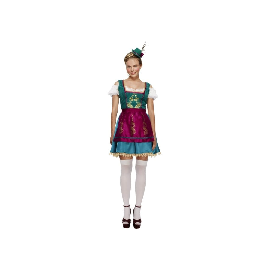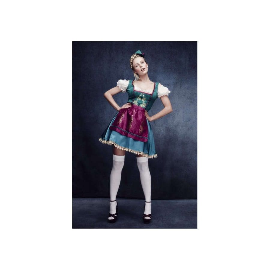 La culture bavaroise est toujours aussi fascinante, surtout avec l'accoutrement très spécial des Bavarois. Ce déguisement de Dirndl de Noël que nous avons ici en est une belle représentation. Il est composé d'une robe de couleur blanche, verte et bleue, garni de motifs dorés, avec un jupon attaché, d'un tablier de couleur violette et d'un mini-chapeau très mignon de couleur verte avec un petit bouton de fleur de couleur violette. Ce déguisement est pour les femmes dont les tailles sont L, M ou S. La robe est un peu courte, n'hésitez donc pas à porter une paire de collants blancs, et bien évidemment des escarpins à talons.
