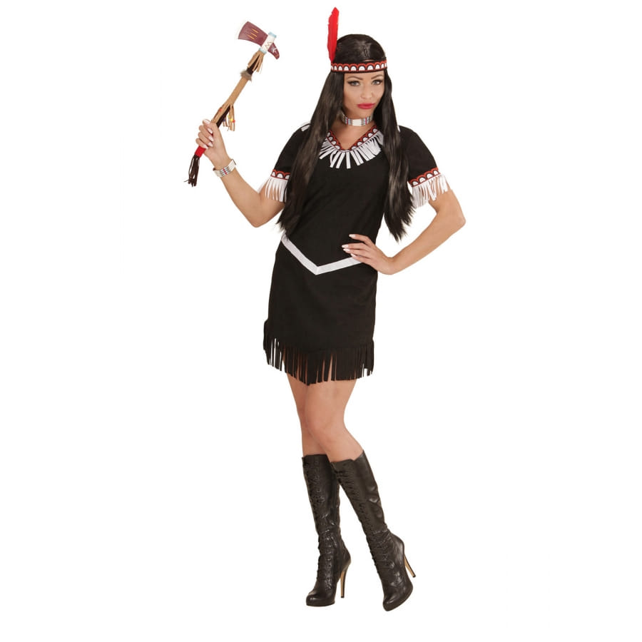 C'est un déguisement pour femme qui comprend une robe noire aux courtes manches agrémentées de motifs typiques indiens et de franges blanches.