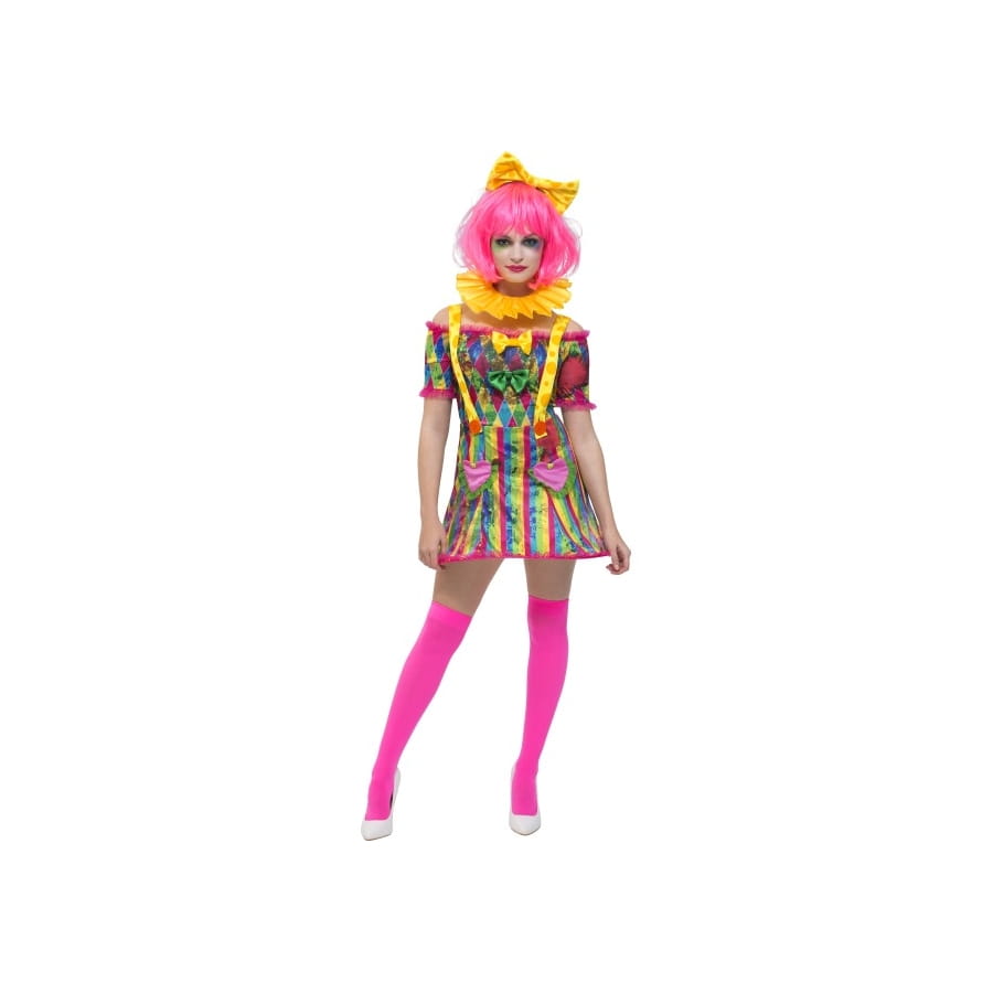 De nos jours, les clowns ne font pas que faire rire, ils peuvent aussi être jolis. C'est ce que nous vous proposons avec ce costume robe sexy de clown Patchwork pour femme. Elle est composée d'une petite robe multicolore à rayures verticales, avec du bleu, du rose, du jaune et du vert, ornée de 2 petits noeuds sur le devant. Des bretelles jaunes y sont attachées, avec deux coeurs roses à l'extrémité, et pour orner les cheveux, un bandeau jaune en forme de gros noeud. Notre modèle peaufine sa tenue avec des bas et une perruque de couleur rose, des accessoires que vous pourrez retrouver dans la section adéquate du site.