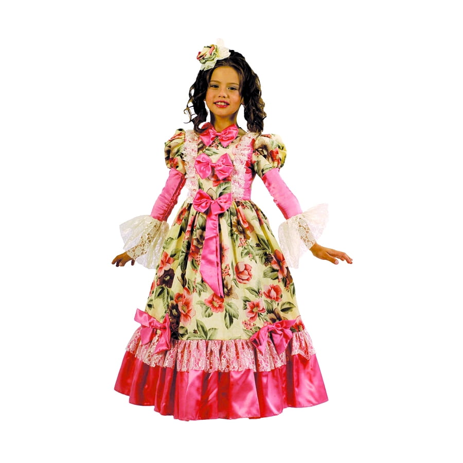 Elle sera resplendissante dans ce déguisement Roccoco du 18 ème. Votre fille sera si mignonne dans que tout le monde ne cessera pas de l'admirer, une véritable petite princesse. Le costume est disponible en plusieurs tailles comme le 96, 104, 116, 128, 140,152 et 164. La robe est rose et blanc avec des noeuds dessus et la coiffe avec une petite fleur dessus.