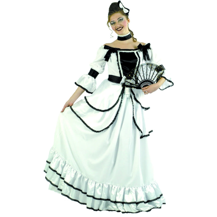 Vous serez la reine de votre soirée déguisée ou d'une soirée à thème romantique ou historique.Vous serez belle et coquette dans cette robe blanche avec des bordures et des rubans noir. Les épaules nues et les manches qui arrivent jusqu'au coudes vous serez divine dedans. Le déguisement comporte aussi un tour du cou et d'une coiffe. Il vous est proposé en deux tailles : 38/40 et 42/44.