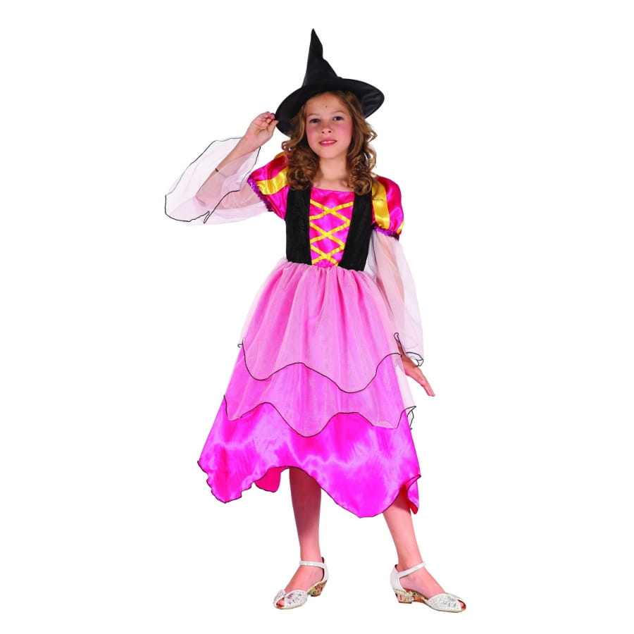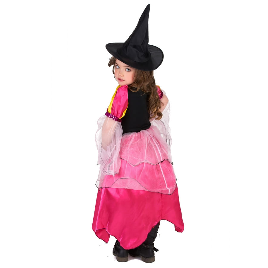 Pour permettre cela, nous vous proposons le costume rose de petite sorcière avec voilage, qui est fait d'une longue robe rose à manches courtes et bouffantes.
