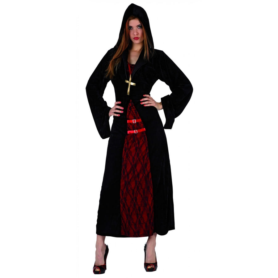 Vous avez décidé de vous transformer en bonne soeur sinistre cette année pour Halloween? Le costume rouge et noir de religieuse pourrait vous intéresser. Il se compose d'une robe noire et rouge façon velours, à manches longues et évasées. Une dentelle bordeaux couvre le devant avec deux poignées rouge au niveau de la taille. Un collier avec une croix argentée en tissu souple complète le déguisement.