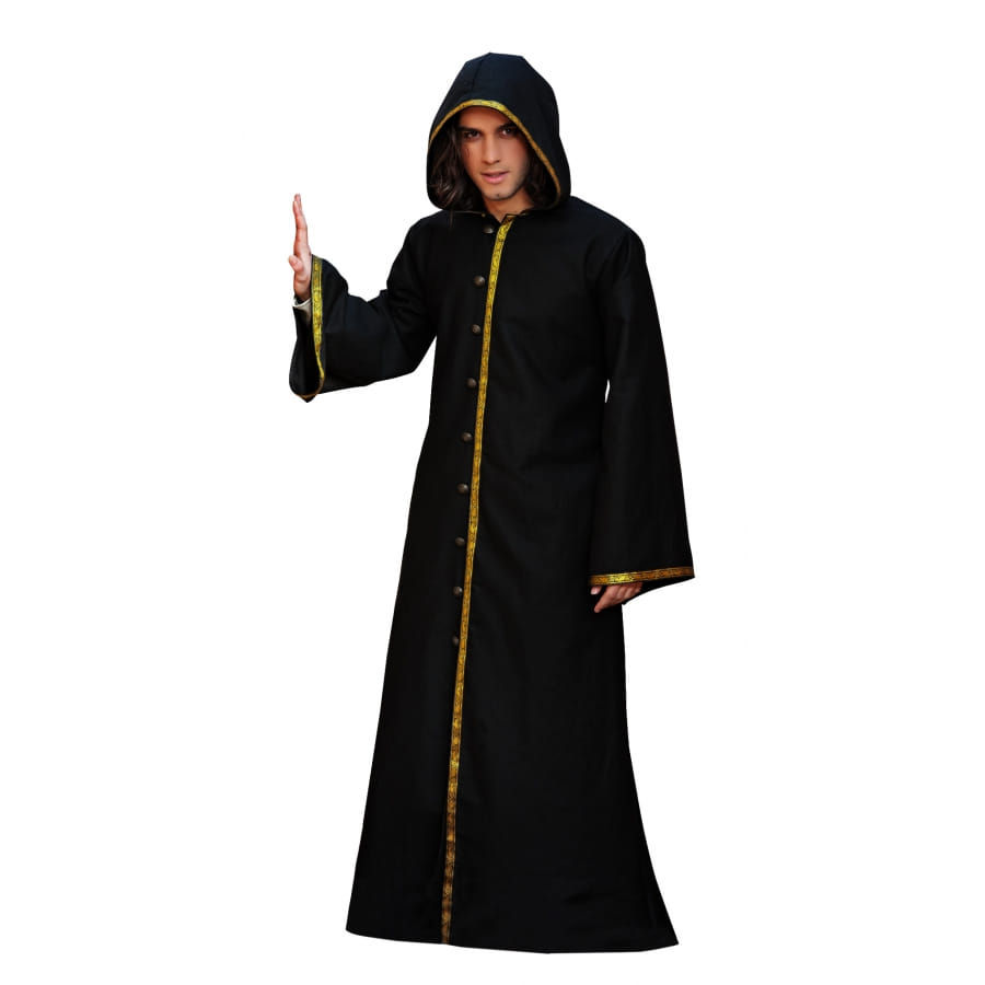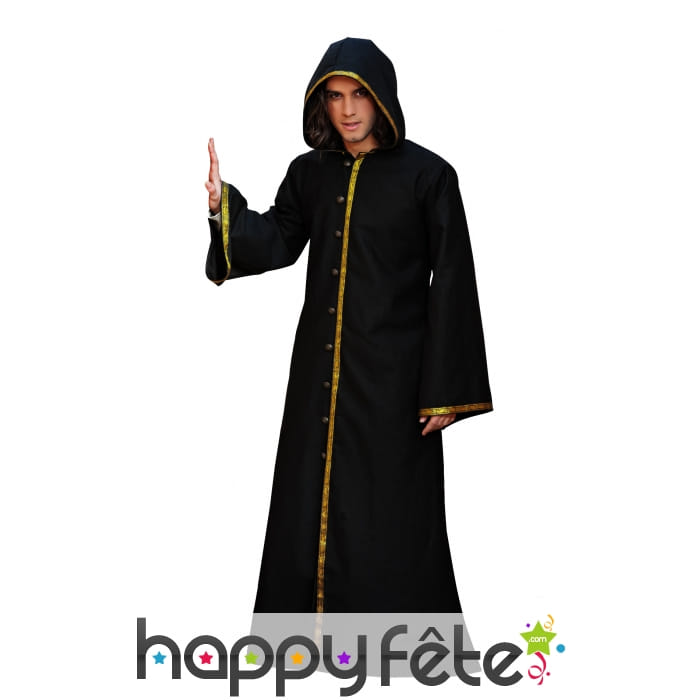 L'époque médiévale, temps des sorciers, temps des mystères ! Tout le monde a peur de la sorcellerie, amusez-vous donc à faire peur à tout le monde ! Afin d'incarner un sorcier de l'époque du Moyen Age, nous vous proposons ce long manteau noir avec capuche sur lequel sont disposés symétriquement des boutons, et une ligne de couleur jaune est dessinée tout le long du manteau ainsi que sur les manches et le capuchon. Ce vêtement vous donnera une allure mystérieuse et plutôt effrayante, déguisement adéquat pour la fête d'Halloween. Vous pourrez incarner un méchant sorcier venu d'une autre époque doté d'immenses pouvoirs magiques. La tenue peut également se porter pour un enterrement de vie de garçon ou de vie de jeune fille. L'ensemble est proposé en taille L et M.