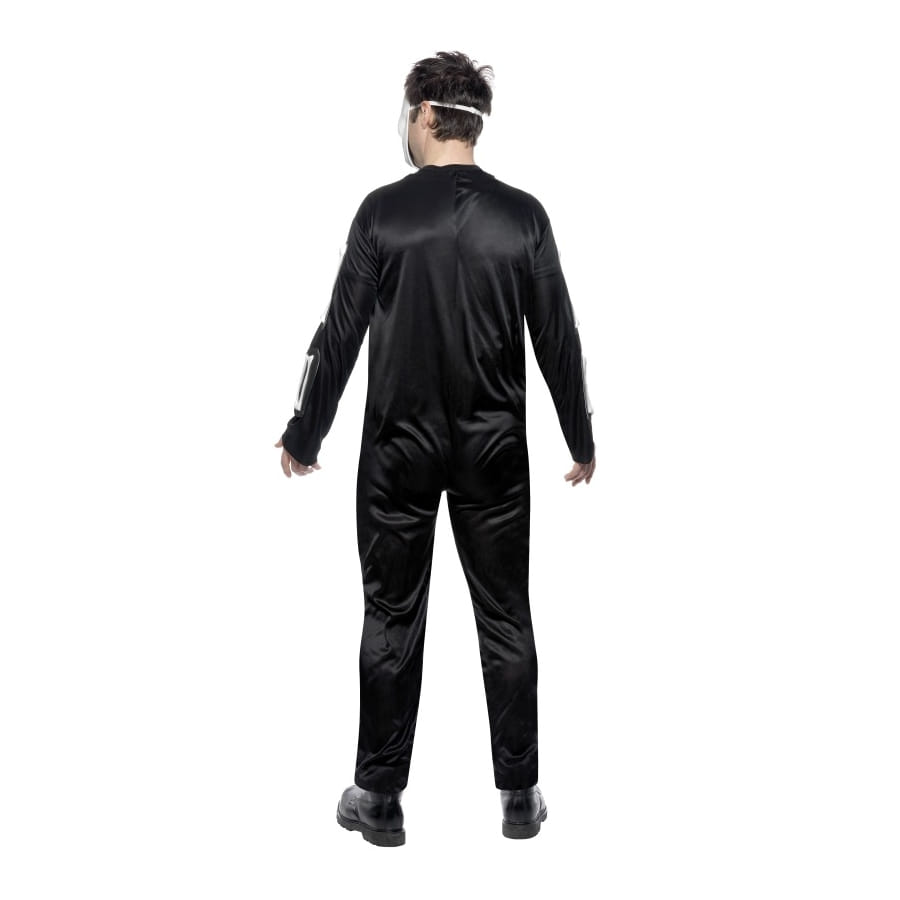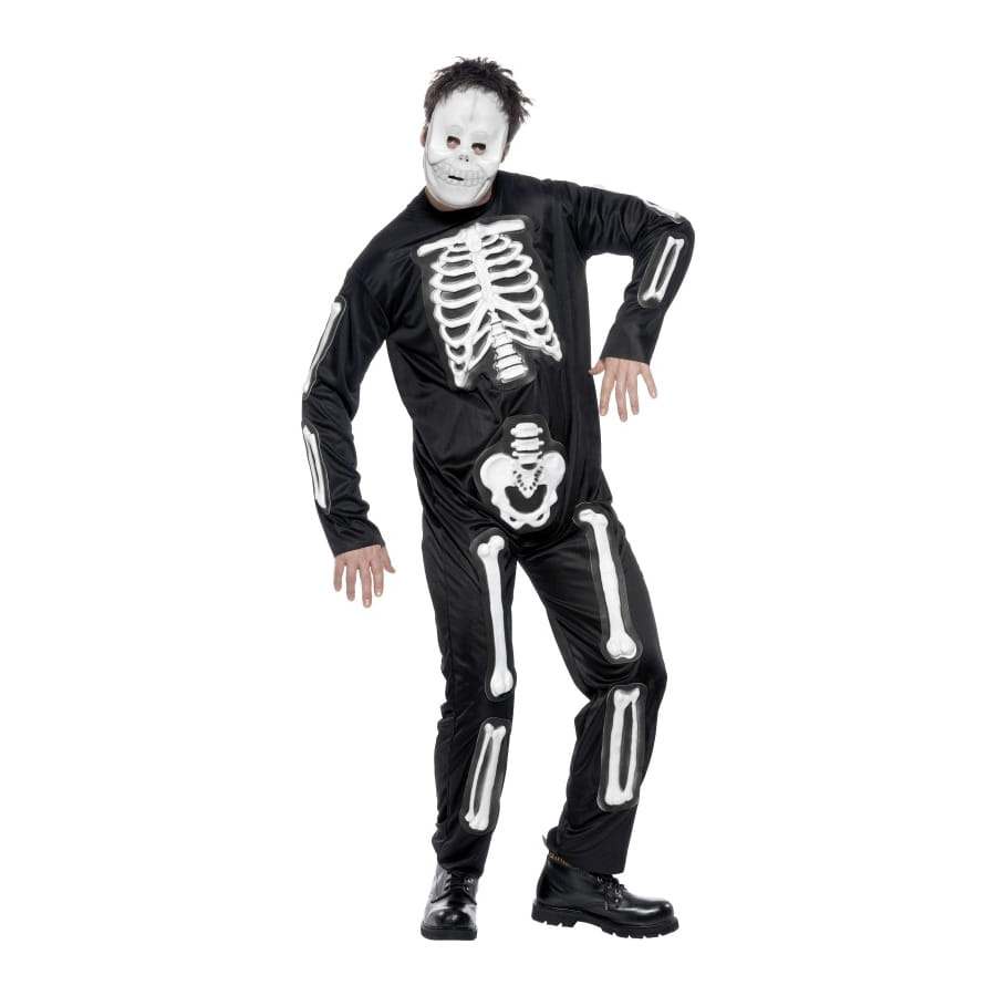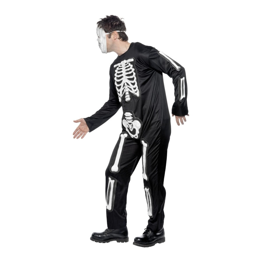 Costume de squelette de couleur noire et blanche pour homme. Le costume est entièrement noir sauf pour les détails du squelette, qui sont imprimés en blanc. Ce costume est un déguisement très simple mais efficace pour une soirée d'Halloween.