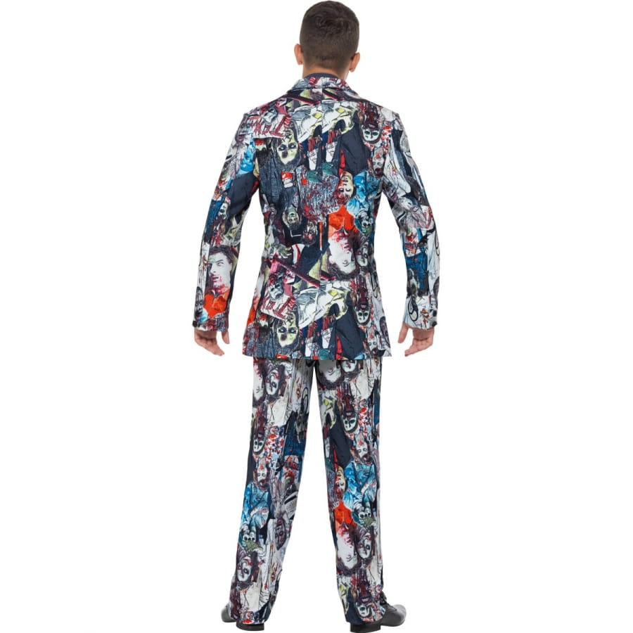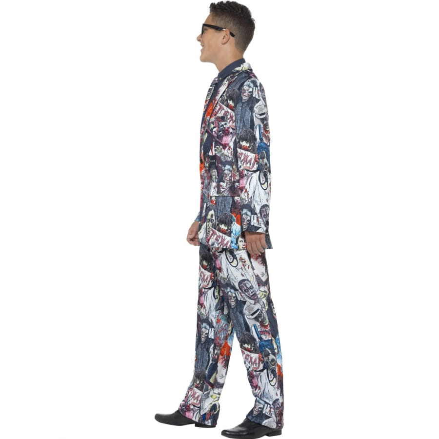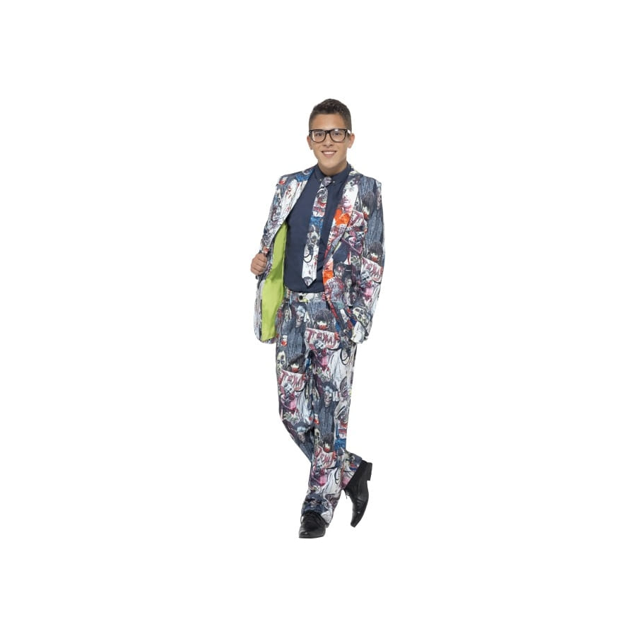 Qui vous a dit que les adolescents n'aimaient pas les costumes trois pièces ? Il suffit juste que le costume soit assez stylé et ait de la personnalité comme ce costume trois pièces motifs zombie pour ado. Nous le proposons pour les fêtes d'Halloween, pour que votre garçon sorte du lot avec un déguisement très classe. Comme tous les autres costumes, celui-ci est composé d'une veste, d'un pantalon et d'une cravate. Mais il se démarque par les imprimés sur le tissu de l'ensemble du déguisement. Avec un fond gris bleu, ce déguisement fait ressortir des dessins de zombie partout sur chacune de ses trois composantes.