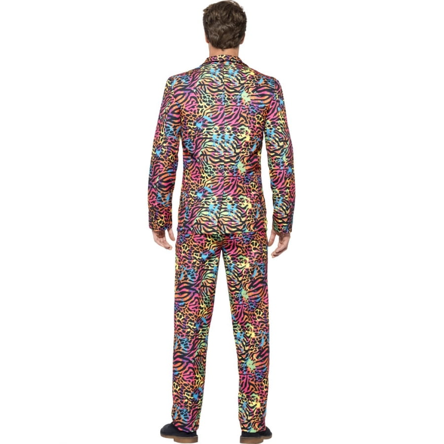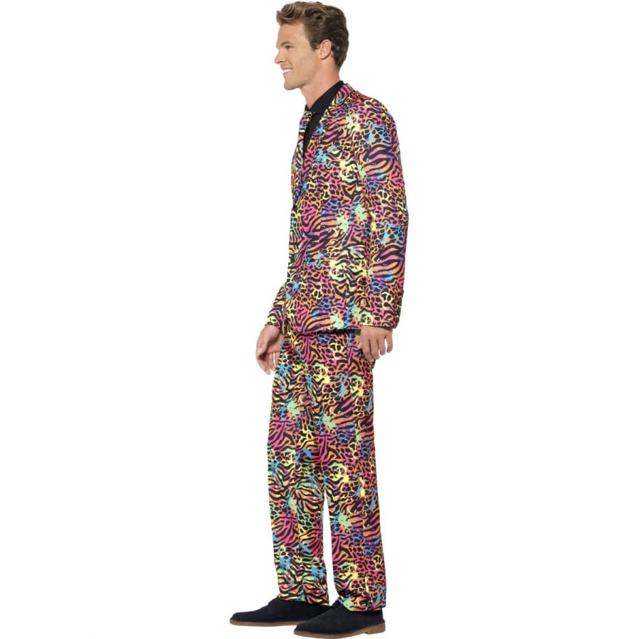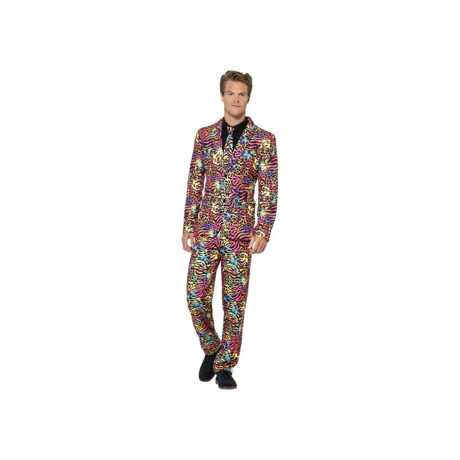 Elégant et très joyeux, voilà les mots qui représentent le plus ce costume trois pièces néon multicolore. Si vous voulez incarner cela, mettez ce déguisement pour aller à une fête costumée car celui-ci vous est dédié Messieurs. Le tissu coloré et plaqué de motifs zèbre et léopard et orné par différentes couleurs dominées par le fuchsia a été utilisé pour élaborer les trois pièces de ce costume : la veste, le pantalon et la cravate. Nous vous conseillons une chemise noire avec, et pourquoi pas des accessoires hippie tout en couleurs sur notre site : perruque, lunettes etc.