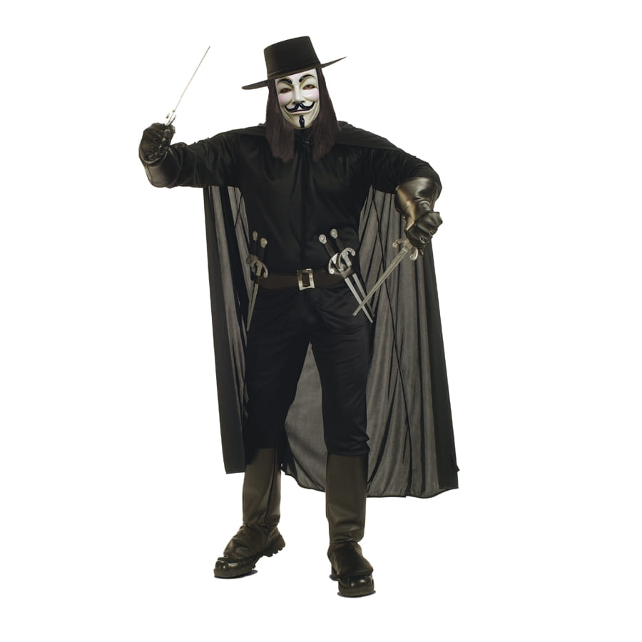 Ce costume V pour Vendetta version luxe est disponible pour vous, Messieurs ! Très complet, il comprend une chemise, un pantalon avec couvre bottes, une cape, une ceinture, un chapeau, un masque et une paire de gants. Réaliste, ce déguisement est parfaitement identique à la tenue du héros du film "V pour Vendetta". Les vêtements sont entièrement de couleur noire et le masque blanc reprend jusque dans les moindres détails l'original. Bref, c'est un déguisement somptueux pour les fans du film et pour entrer dans la peau d'un justicier redoutable à l'occasion de la soirée Halloween, d'un carnaval ou d'un bal costumé.