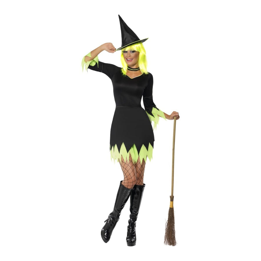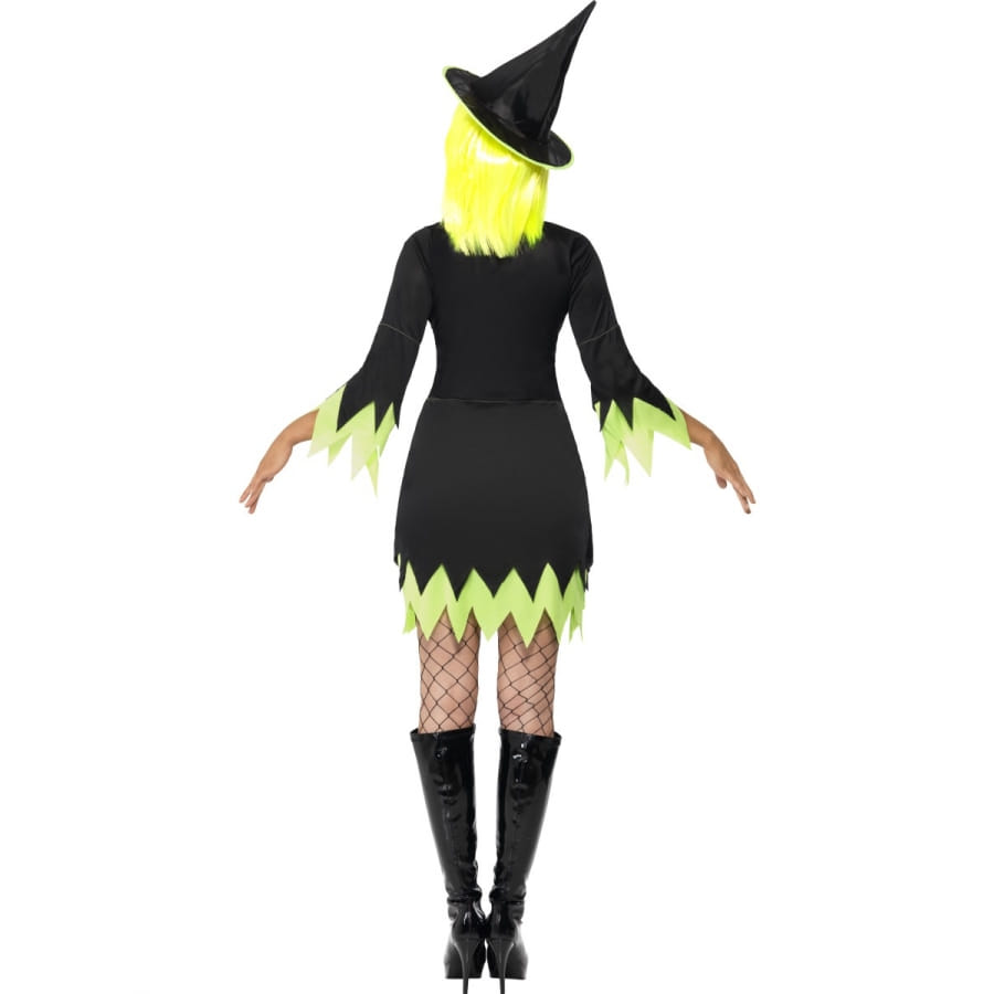 Set de déguisement de sorcière de couleur noire et verte, pour femme. Cet ensemble est composé d'une robe, d'un serre-cou et d'un chapeau, tous trois agrémentés de touches vert fluo. Les tailles que vous trouverez disponibles sur le site incluent le S, le M et le L. C'est un déguisement très approprié pour une fête Halloween festive et amusante.