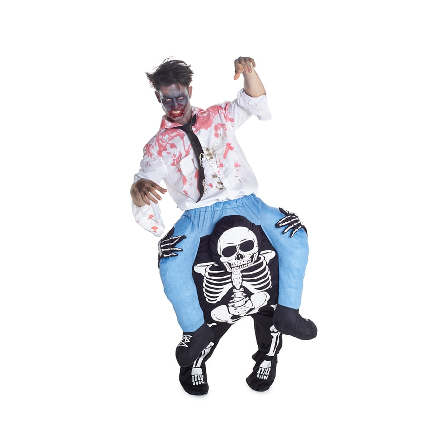 Glissez-vous dans un costume aussi effrayant qu'original pour Halloween ! Que diriez-vous d'être un zombie qui chevauche un squelette ? Costume zombie à dos de squelette se présente comme une paire de fausses jambes bleues rembourrées qui chevauchent un squelette noir et blanc. C'est dans la partie squelette du costume que vous enfilez vos jambes. L'ensemble est à la fois drôle et terrifiant, surtout si vous êtes maquillé comme il faut !