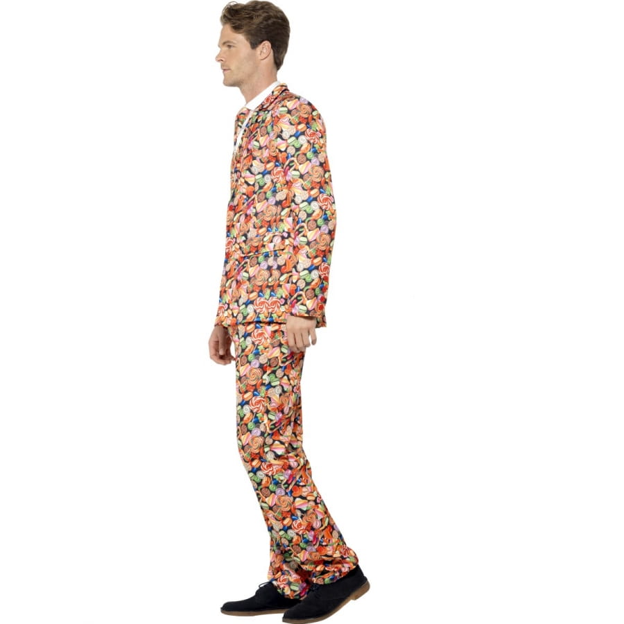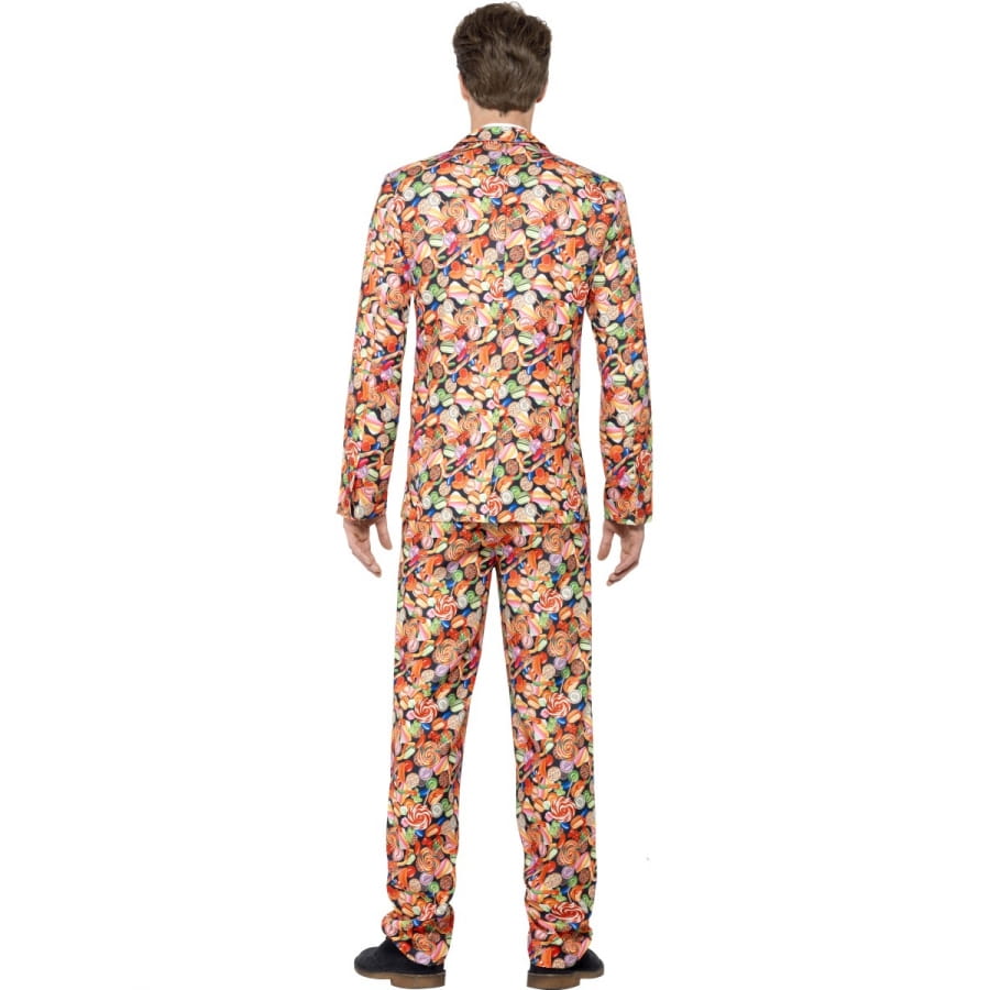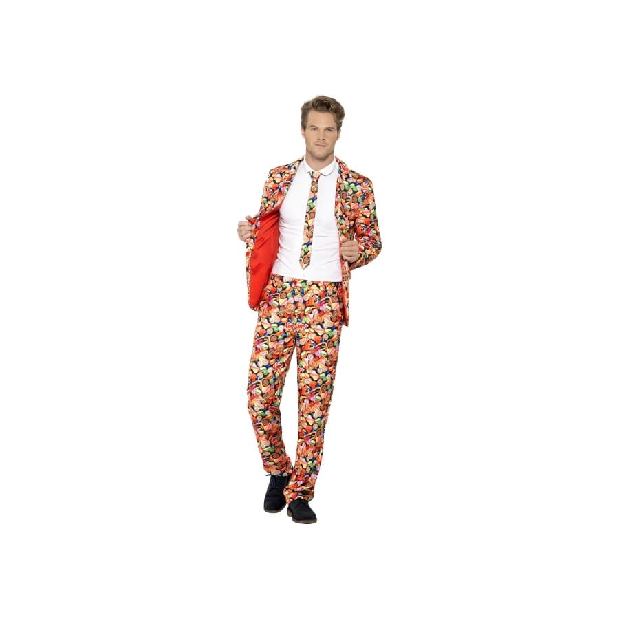 Soyez élégant en toute occasion et choisissez de mettre des costumes même en vous déguisant. Nous proposons des tas de costumes trois pièces respectant différents thèmes et celui-ci est un costume trois pièces sucreries multicolores. Une veste, un pantalon et une cravate le composent, trois pièces qui ont été faites avec le même tissu très coloré où vous trouverez des tas de sucreries bleu, orange, rouge, rose etc. Mais l'ensemble du costume est dominé par le rouge. La coupe du costume est très ajustée avec un style slim, que vous remarquerez même pour la cravate. Si vous allez à une fête d'enfant avec, attention de ne pas vous faire dévorer par ces petits mangeurs de sucreries.
