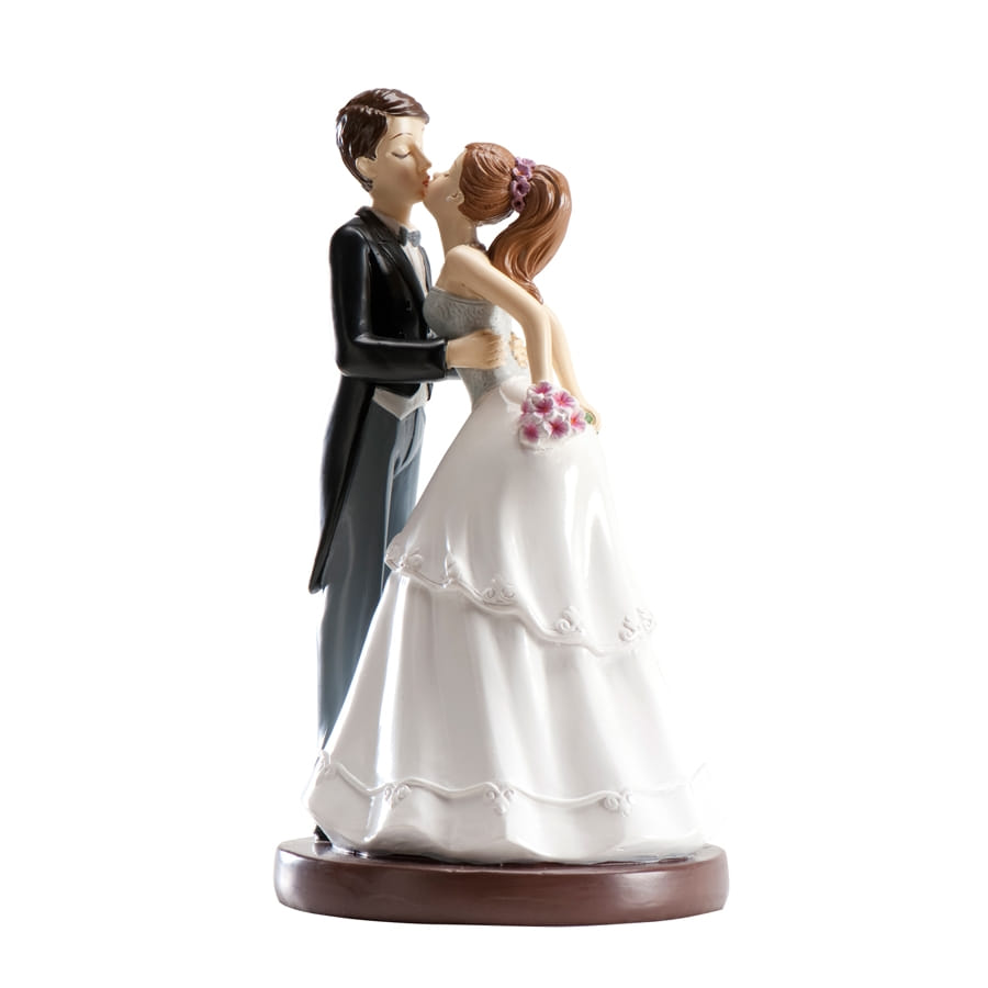 Que vous soyez amateur ou professionnel de la pâtisserie, ce couple marié décoratif pour pâtisserie peut toujours servir. C'est un kit en PVC avec un homme en costume noir et une femme en robe de mariée, qui se donnent un baiser sur un petit socle marron. Cet élément décoratif mesure 16 cm de hauteur, il s'utilise très facilement car il suffit de le poser sur le sommet d'un gâteau de mariage !
