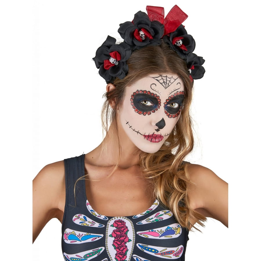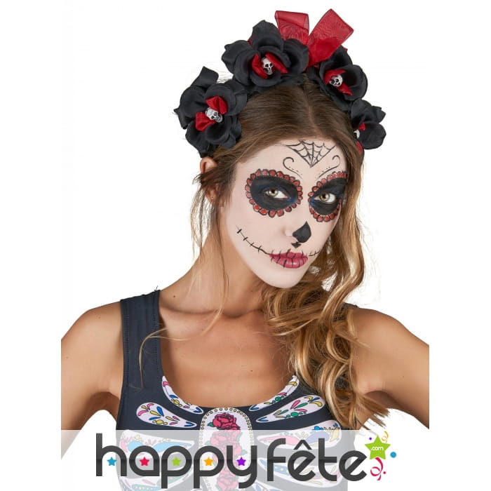 Célébrez le jour des morts mexicain en portant sur votre tête cette couronne de Fleurs Dia De Los Muertos noir rouge pour adulte.