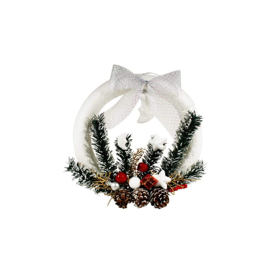 Cette très jolie couronne de Noël 'polaire' est fabriquée en polystyrène et en PVC. Elle est de couleur blanche, ornée d'un ruban blanc et argent, de pins, de branches et d'étoiles. Elle mesure environ 30 centimètres.