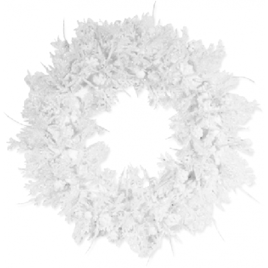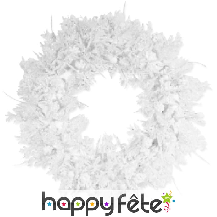 Couronne de Noël en polystyrène et PVC de couleur blanche et parsemée de paillettes. Cet accessoire mesure environ 25 centimètres. Accrochez où vous souhaitez cette couronne pour un effet polaire et frais pour les fêtes de fin d'année.