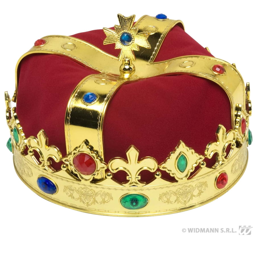 Couronne de roi ornée de fausses pierres de couleur bleue, or, bronze, rouge et verte. Cette couronne ornée de motifs dorés en forme de losanges et de lys et surmontée d'une croix dorée avec une pierre bleue complétera à merveille un déguisement de roi pour une soirée basée sur le thème du Moyen Age.