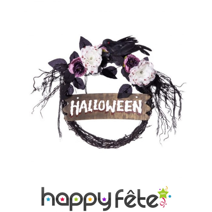 Une petite plaque portant l'inscription Halloween en blanc est fixée au centre.