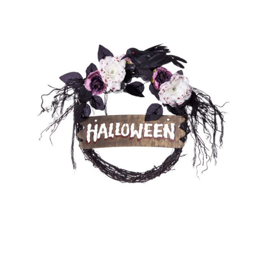 La couronne Halloween noire avec fleurs pour porte mesure 34 cm.