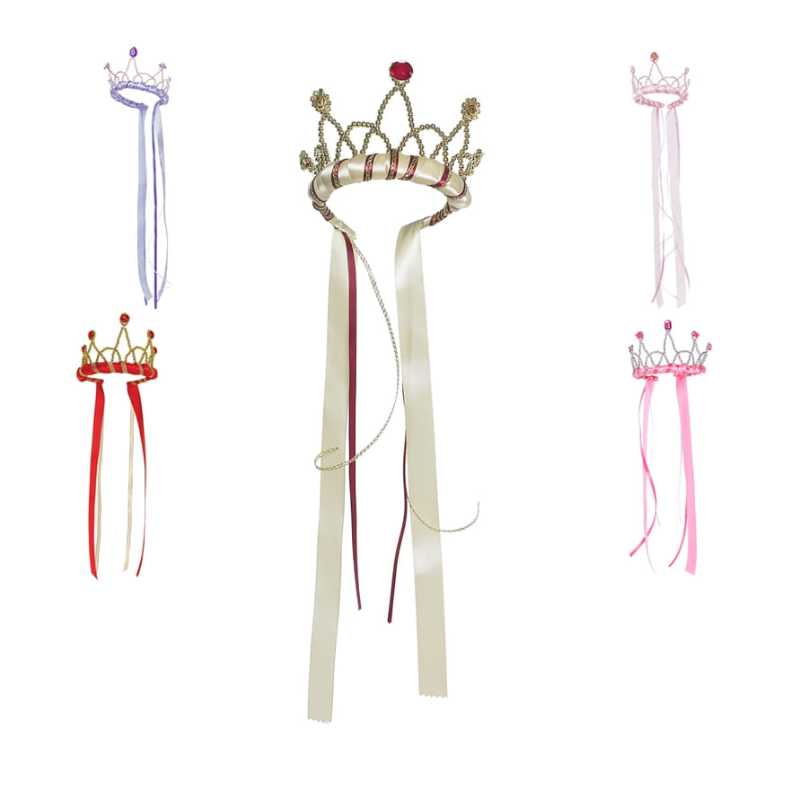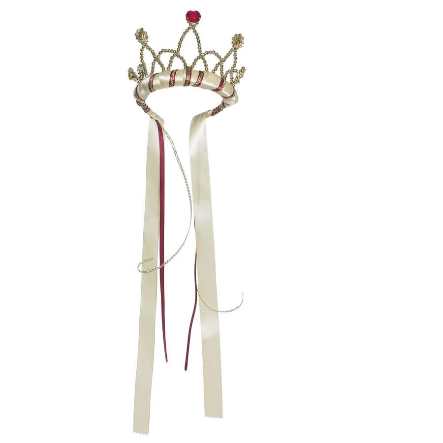 Cette couronne est décorée de perles et de fausses pierres précieuses.