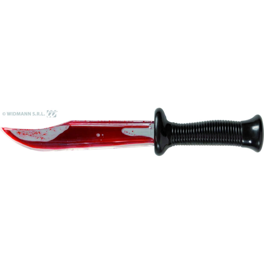 Couteau ensanglanté argenté et noir. Cet accessoire fait 33 centimètres de longueur. Il est idéal pour un déguisement de tueur en série.
