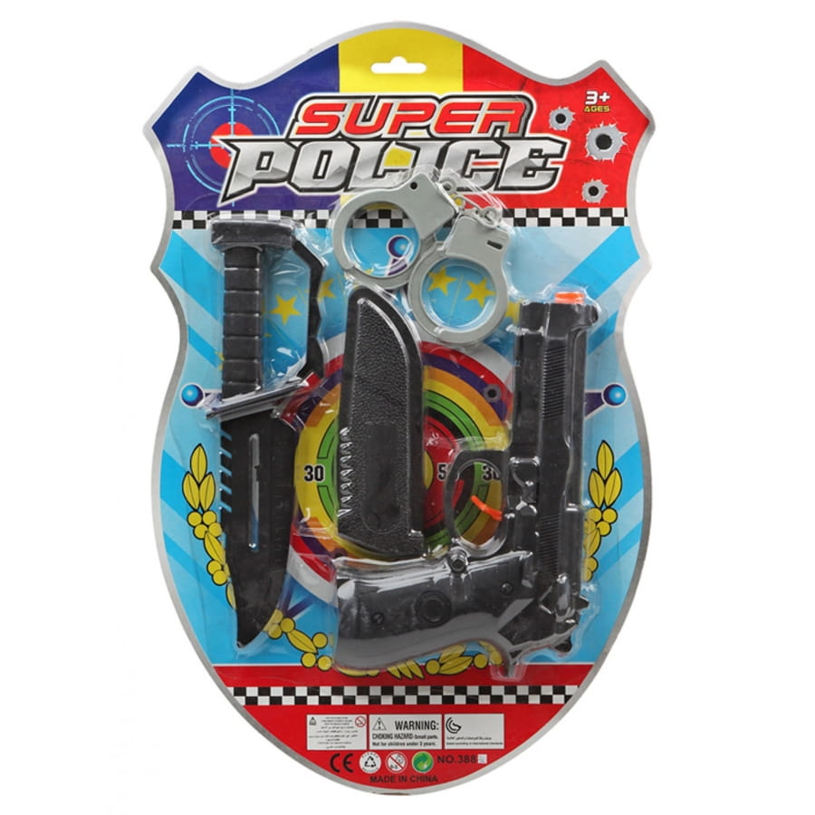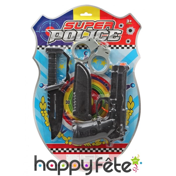 Le couteau, le pistolet et les menottes de policier pour enfant sont factices.