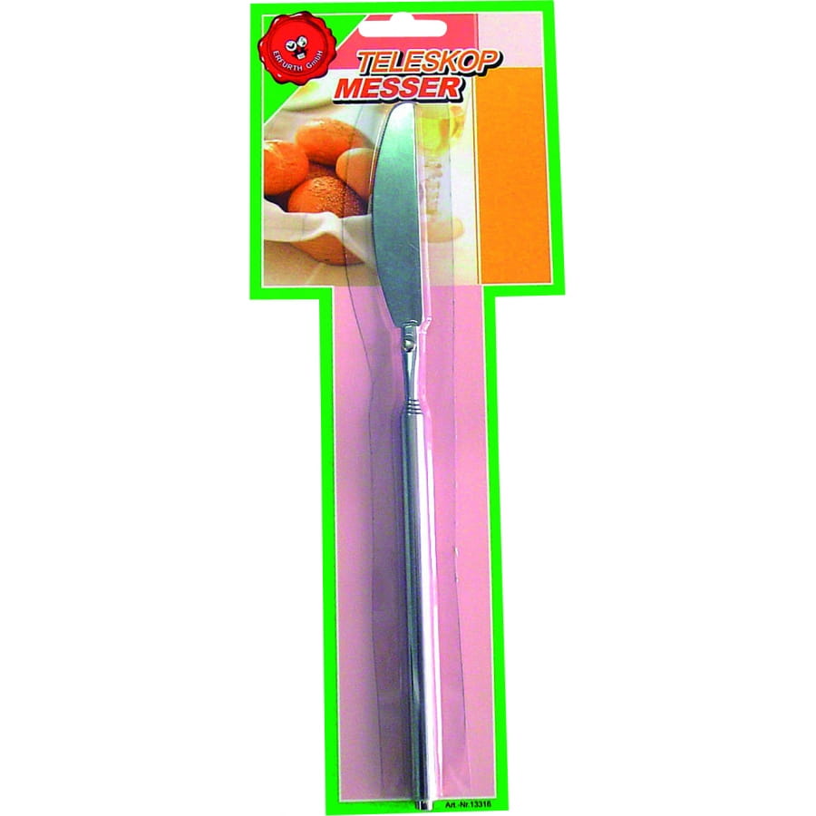 Couteau télescopique argenté mesurant 23 centimètres lorsqu'il est replié et 63 centimètres déplié. Cet accessoire de farce et attrape ne convient pas aux enfants de moins de 3 ans.