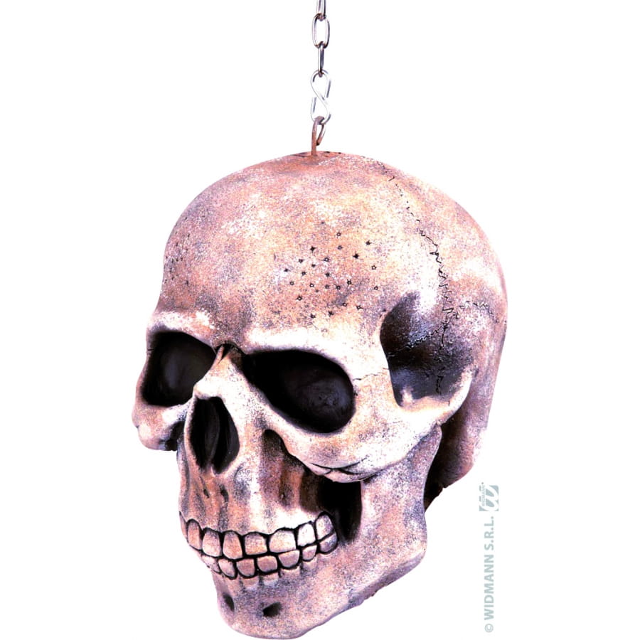 Crâne à suspendre blanc avec chaînette incluse. Cet accessoire mesure 20 centimètres. Pour une décoration effrayante et sombre, accrochez ce crâne à un endroit stratégique.