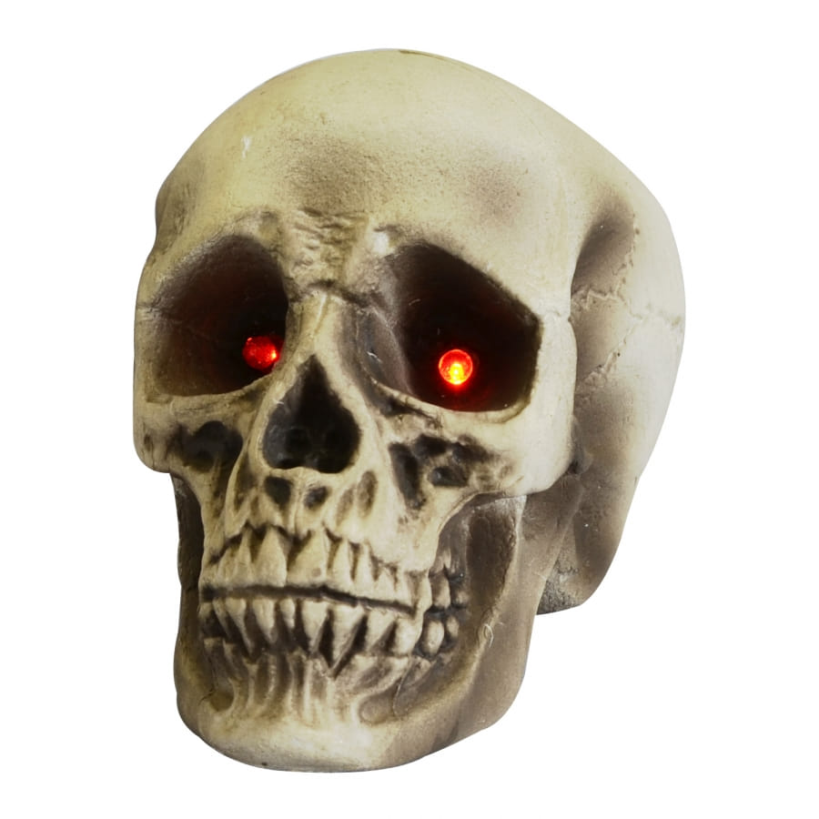 Les têtes de mort sont toujours les bienvenus à Halloween ! Celui-ci sera parfait à l'entrée ou sur le buffet. Il s'agit d'un crâne en polystyrène de couleur beige. Il fait 21 x 15 x 15 cm de dimension, et est doté de deux petites pupilles lumineuses. Il est livré avec ses 3 piles.