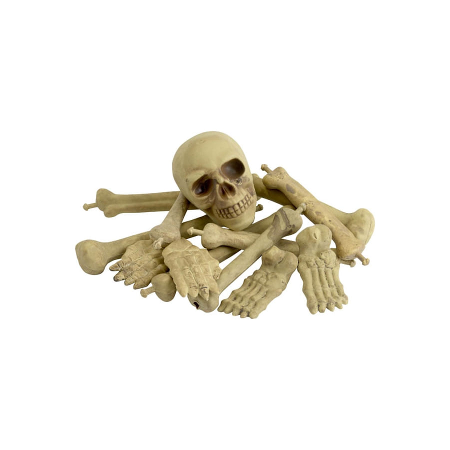 Squelette complet en pièces détachées composée d'un crâne et d'un sac d'os de couleur blanche. Empilez-les tous ou placez chacune des pièces dans un recoin pour une décoration d'Halloween sombre et terrifiante.