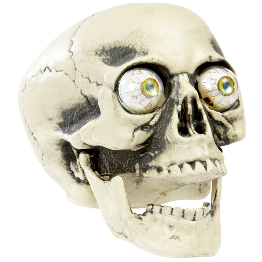 Le crâne avec des yeux globuleux ultra réalistes de 20 x 15 cm est en plastique.