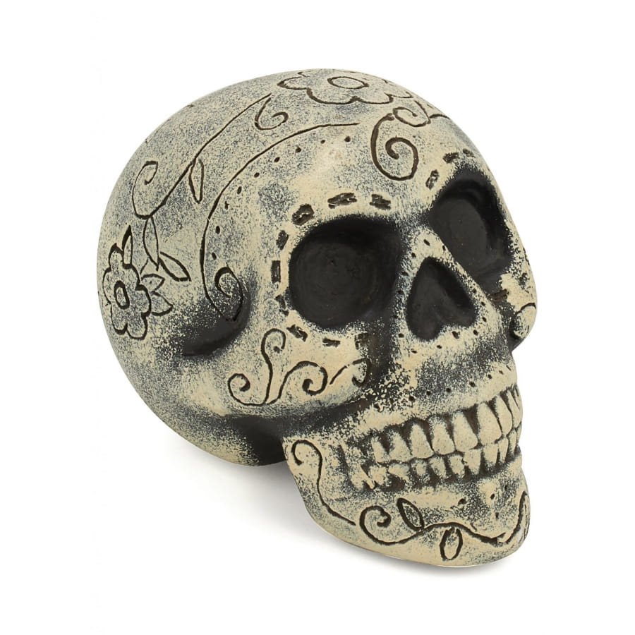 Il représente une tête de mort gravée de motifs floraux noirs.