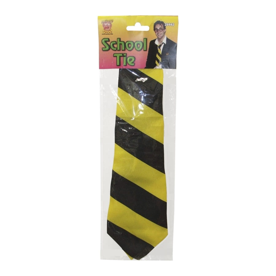 Petite cravate d'écolier, pour homme. Cet accessoire est à rayures de couleur noire et jaune et sera idéal pour un déguisement d'écolier, pour une soirée déguisée.