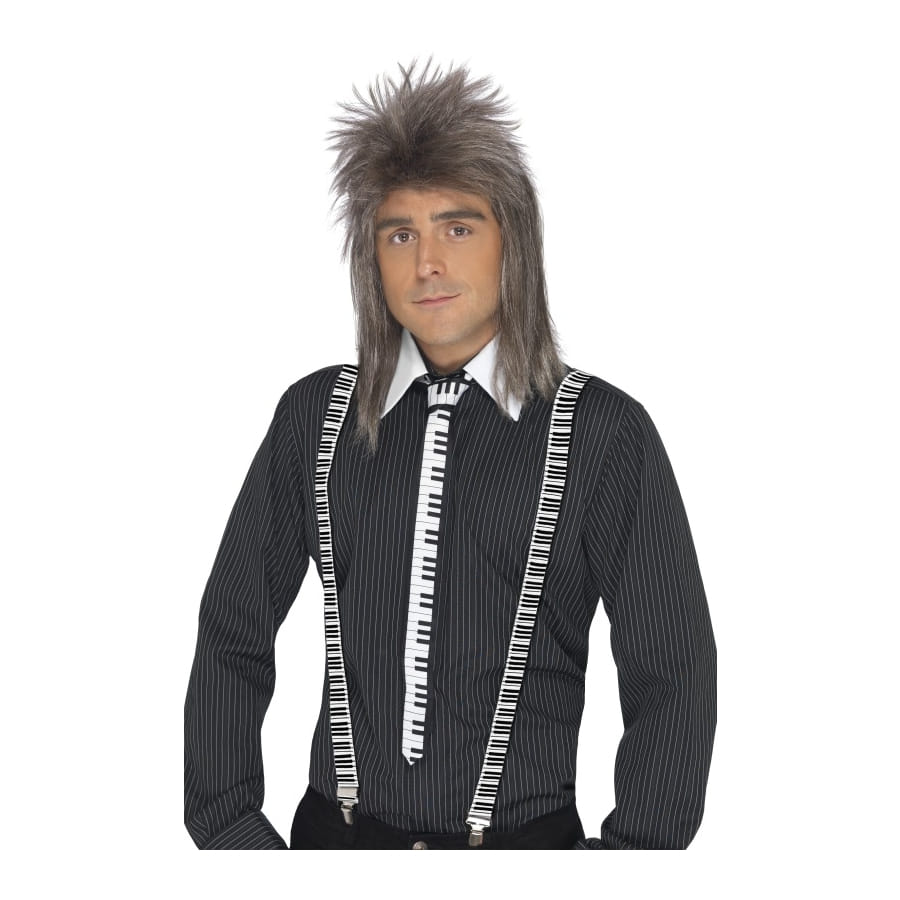 Ensemble cravate et bretelles de couleur blanche et noire, style "piano", pour homme. La cravate est longue et minde tandis que les bretelles sont en élastique.