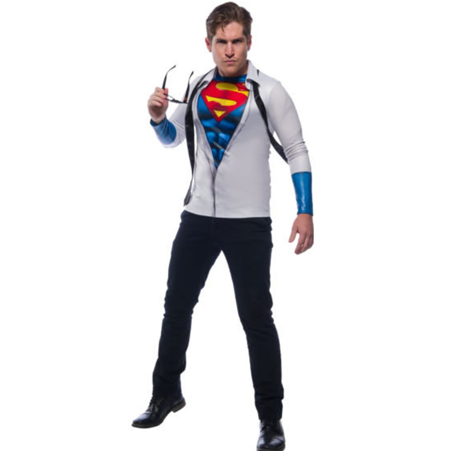 Cette tenue consiste en un haut à longues manches qui simulent une chemise entrouverte en dessous de laquelle on peut apercevoir le costume bleu de Superman avec son initial en jaune et rouge.