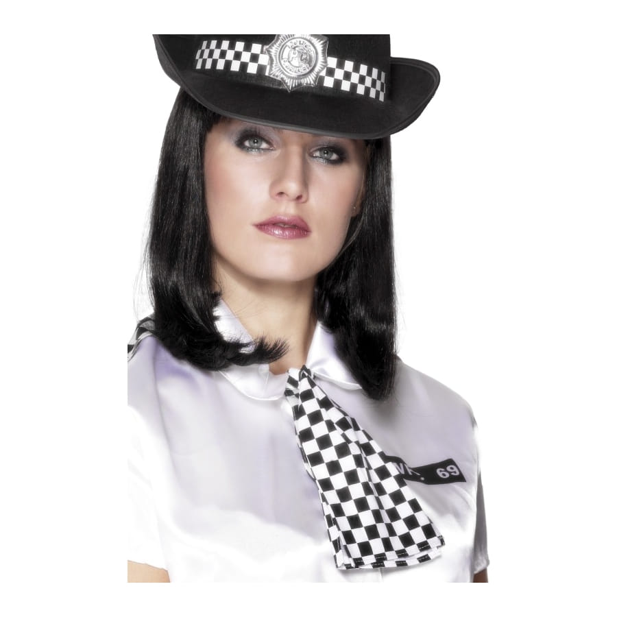 Cravate de femme policière anglaise, imprimée de carreaux noirs et blancs. Cette cravate vous permettra de compléter avec succès un déguisement de policière britannique pour une fête basée sur les uniformes et les métiers.
