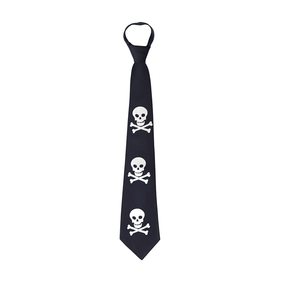 Longue cravate de couleur noire imprimée de 3 têtes de mort blanches, pour homme ou femme. Cet accessoire en polyester est équipé d'un élastique réglable qui vous permettra de l'ajuster pour mieux correspondre à votre déguisement ou tenue. Les motifs font de cette cravate un accessoire idéal pour une tenue punk, gothique ou pour compléter un déguisement d'Halloween.