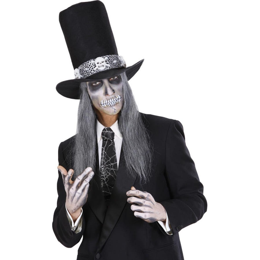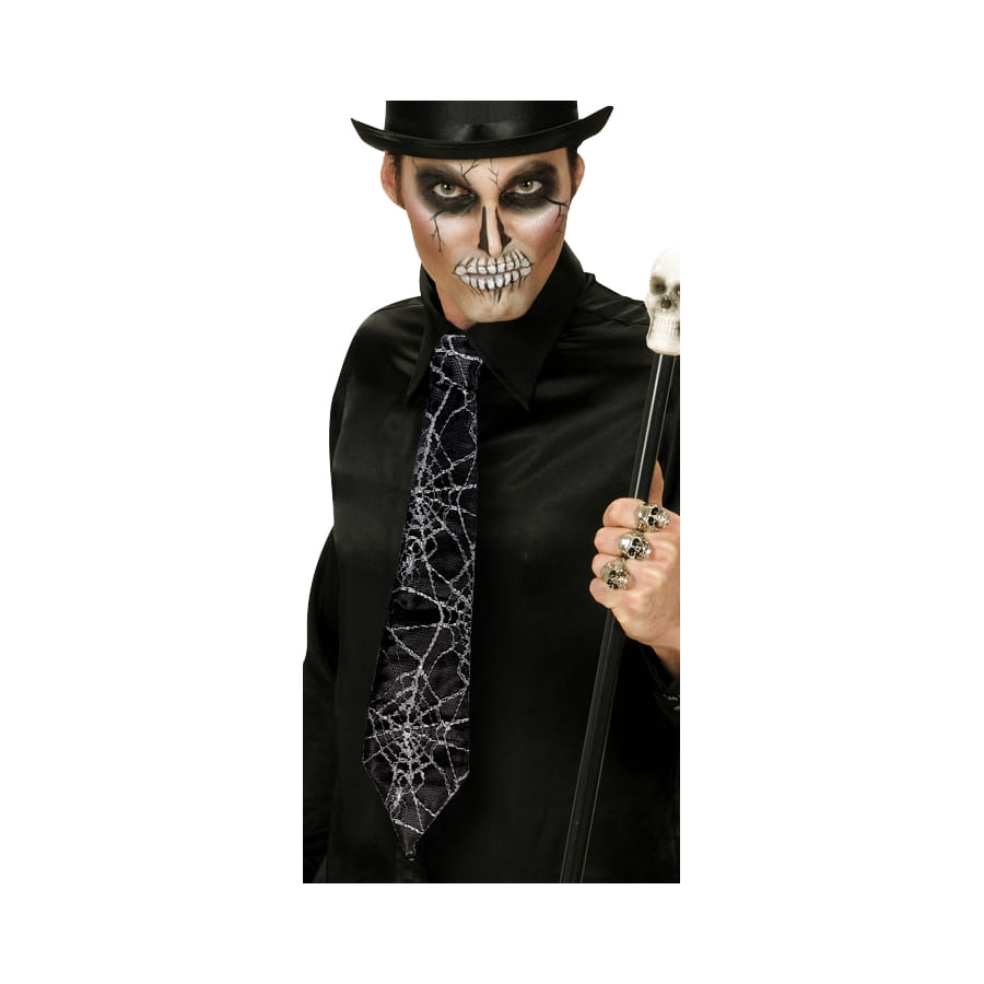 Cravate 'Spider', pour homme. Cet accessoire est entièrement en satin de couleur noire, avec une multitude de toiles d'araignées de couleur blanche imprimées dessus. Elle sera appropriée pour un déguisement d'Halloween chic et mystérieux.