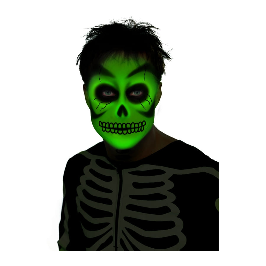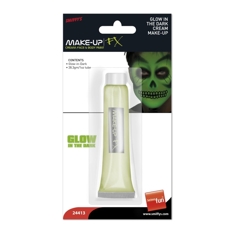 Crème de maquillage luminescente et phosphorescente de couleur verte, pour homme, femme, adolescent, adolescente, garçon ou fille. Vous ne reviendrez pas de l'effet que fera ce simple accessoire sur votre déguisement. Non seulement serez-vous visible dans le moir, mais en plus, votre maquillage sera doublement terrifiant!